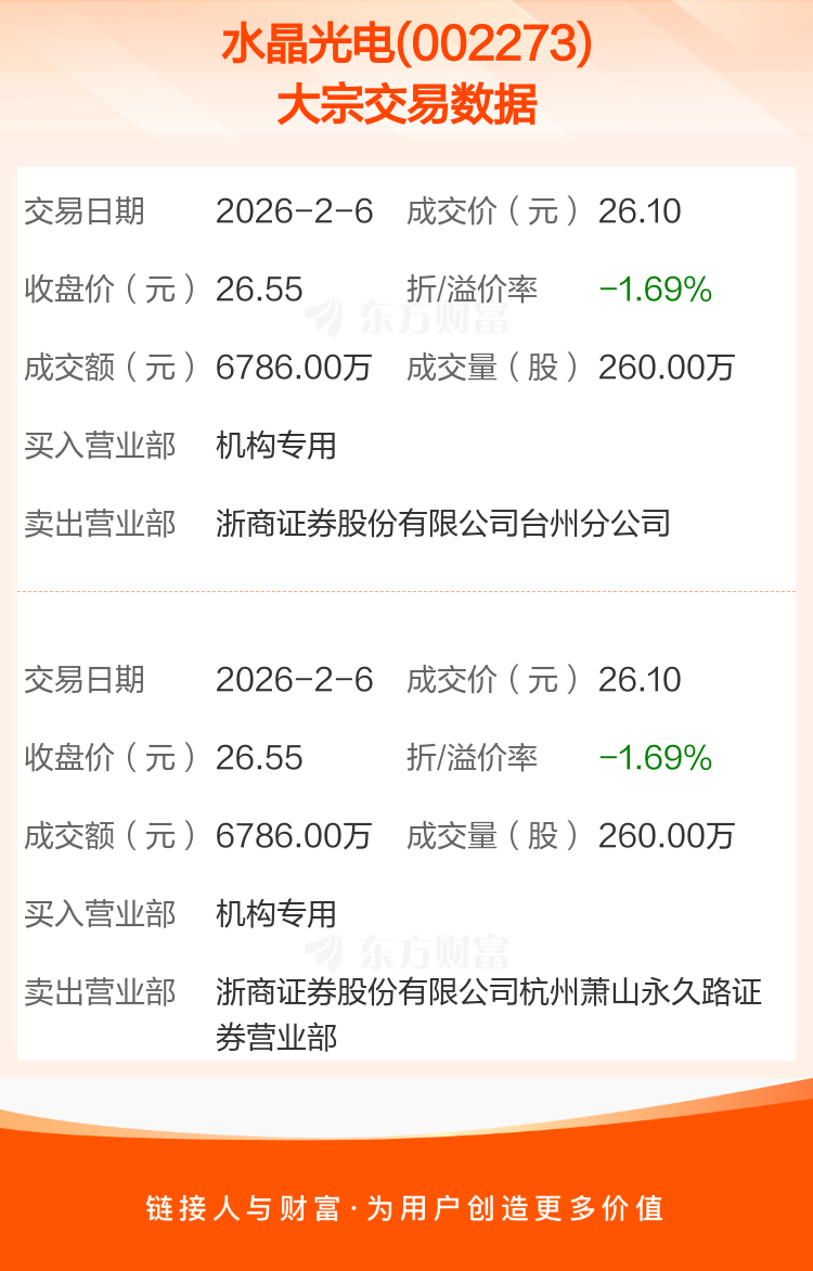 2026年2月6日,水晶光电发生2笔大宗交易,共成交520.00万股,成交金额1.36亿元,占其流通市值比例为0.38%。