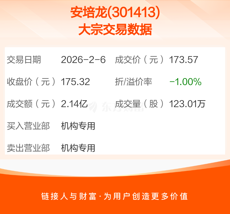 2026年2月6日,安培龙发生1笔大宗交易,共成交123.01万股,成交金额2.14亿元,占其流通市值比例为2.07%。