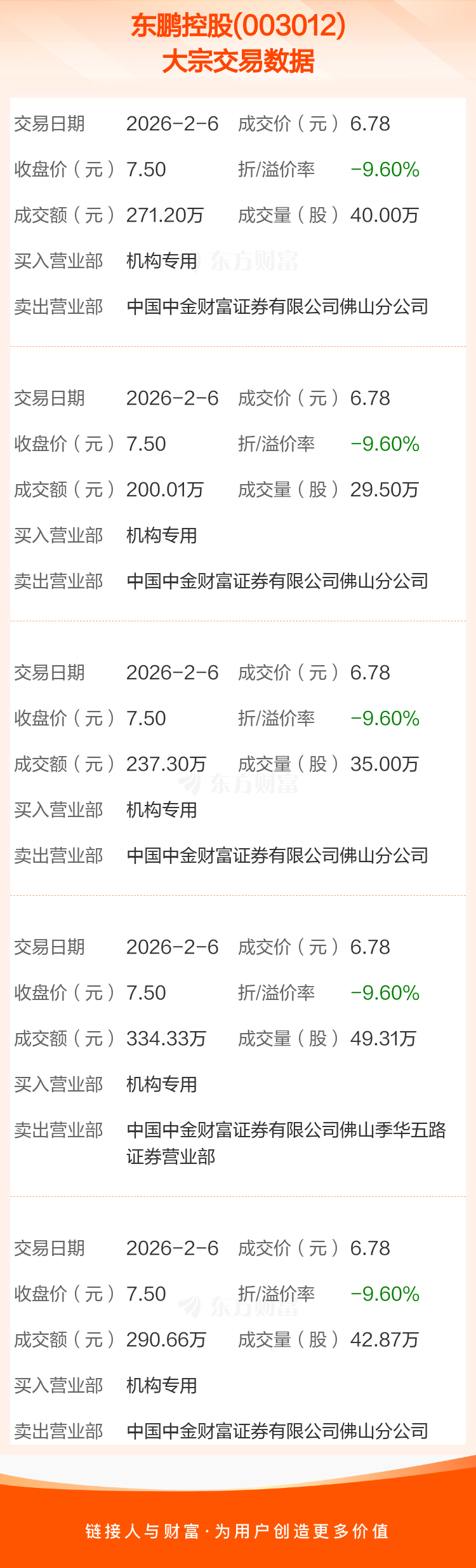 2026年2月6日,东鹏控股发生5笔大宗交易,共成交196.68万股,成交金额1333.50万元,占其流通市值比例为0.16%。