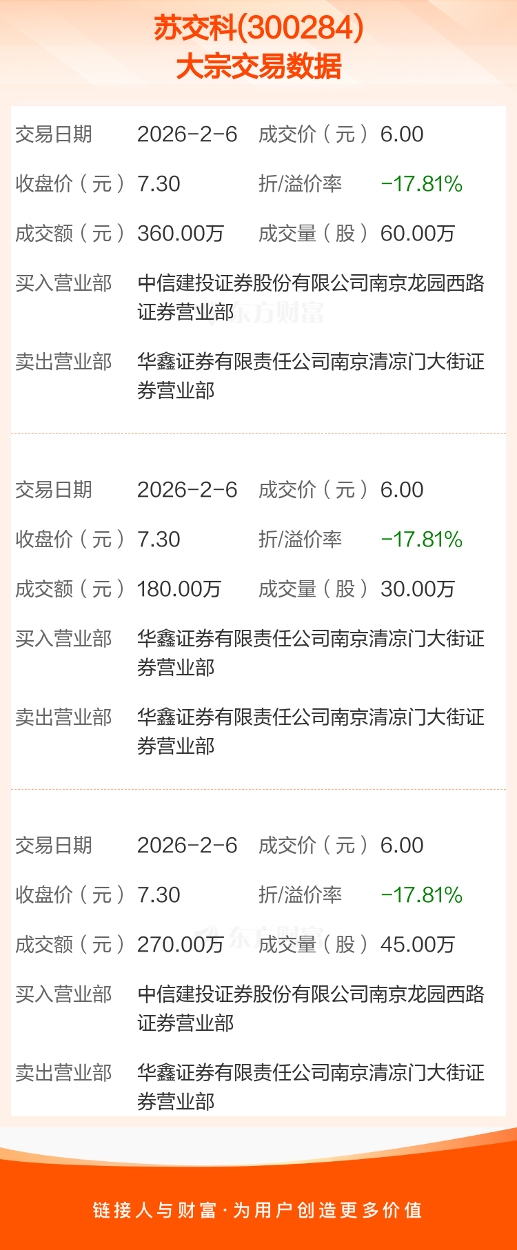 2026年2月6日,苏交科发生3笔大宗交易,共成交135.00万股,成交金额810.00万元,占其流通市值比例为0.09%。