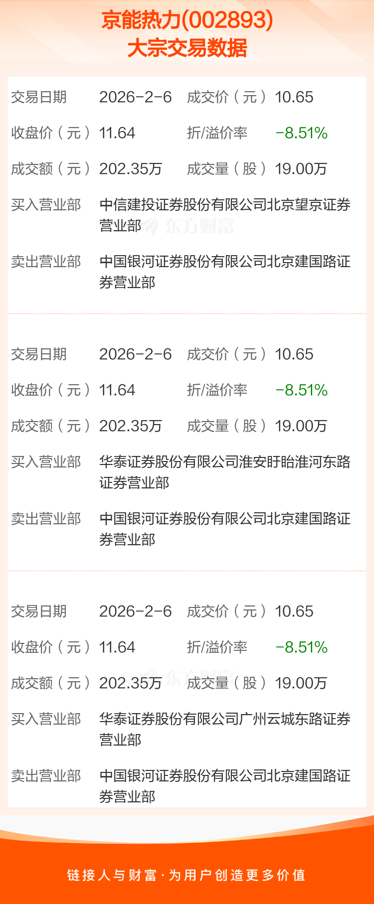 2026年2月6日,京能热力发生3笔大宗交易,共成交57.00万股,成交金额607.05万元,占其流通市值比例为0.26%。