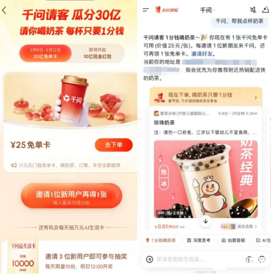 2月6日,千问APP开启“瓜分30亿”春节免单活动,宣布在2月6日至12日期间,向全国用户发放20亿张免单卡和10亿现金红包。活动一经推出,迅速引发关注。当日上午,记者亲身体验,从打开APP到完成下单支付,全程耗时约22分钟,成功以2元价格购买三杯奶茶,真实还原了此次AI驱动的“免单点餐”全过程。