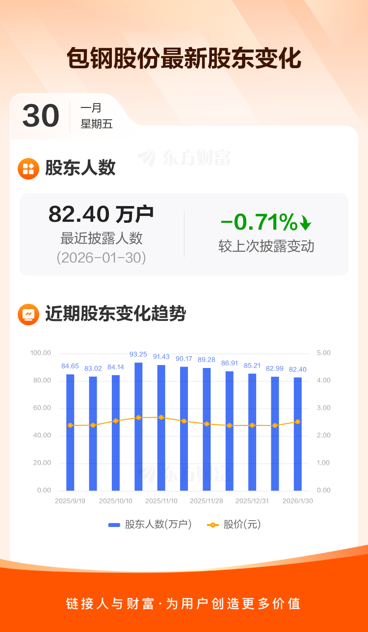 包钢股份最新披露数据显示,截至1月30日公司股东户数为82.40万户,较上期(2026年1月20日)减少5876户,降幅为0.71%。户均持有流通股数量由上期的3.78万股上升至3.81万股,户均持股金额由上期的8.96万元增加至9.56万元。