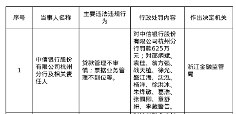 中信银行杭州分行被罚625万,涉贷款管理不审慎等