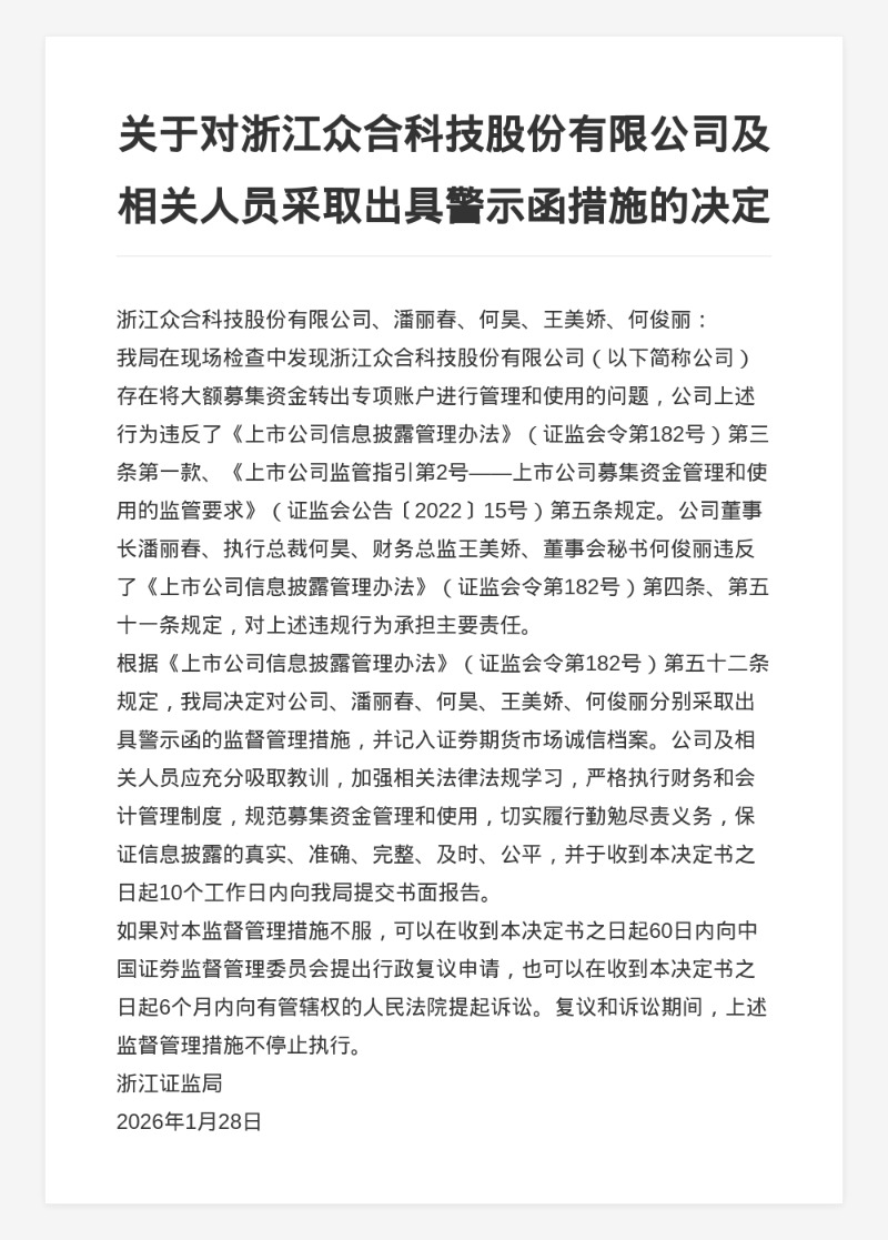 浙江众合科技被出具警示函,涉违规使用募集资金