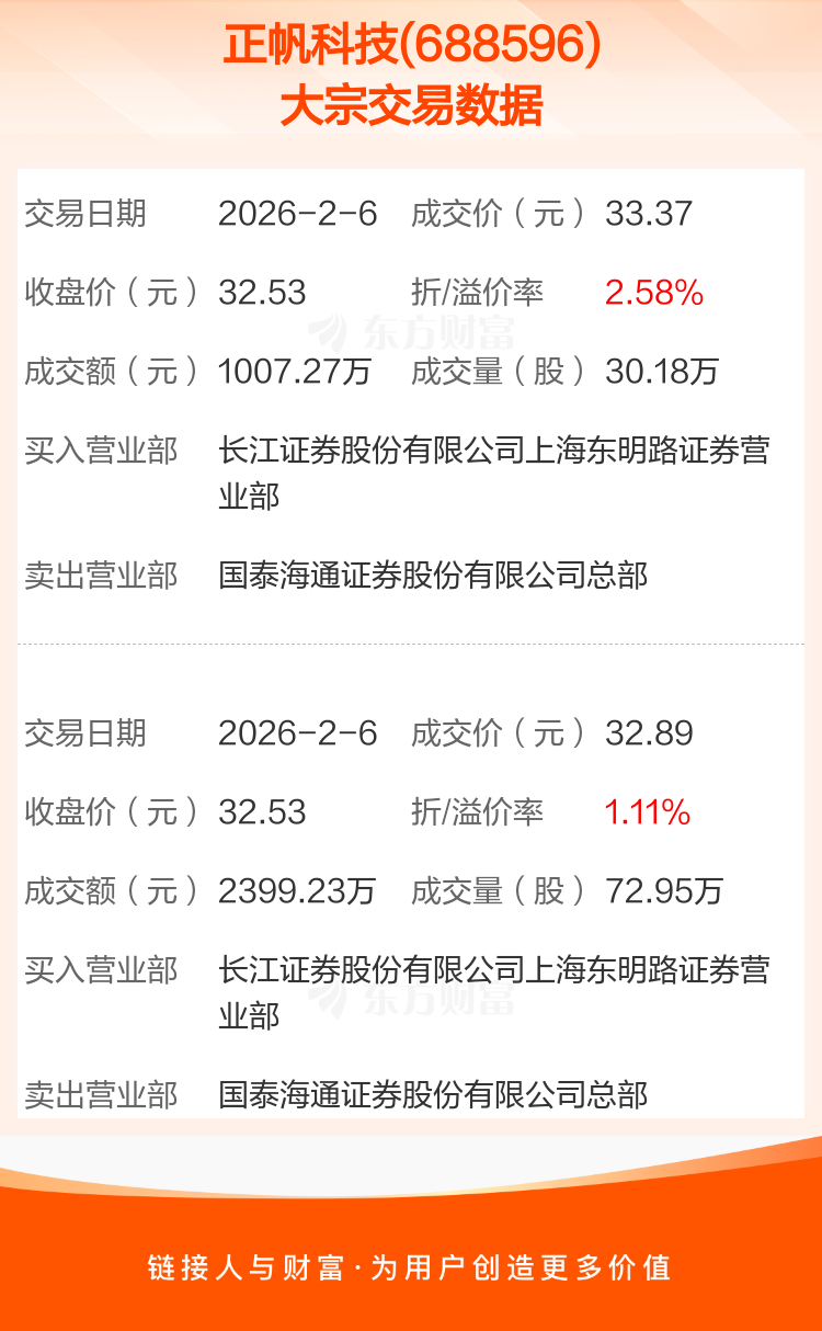 2026年2月6日,正帆科技发生2笔大宗交易,共成交103.13万股,成交金额3406.50万元,占其流通市值比例为0.36%。