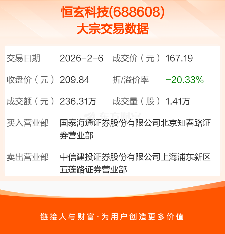2026年2月6日,恒玄科技发生1笔大宗交易,共成交1.41万股,成交金额236.31万元。
