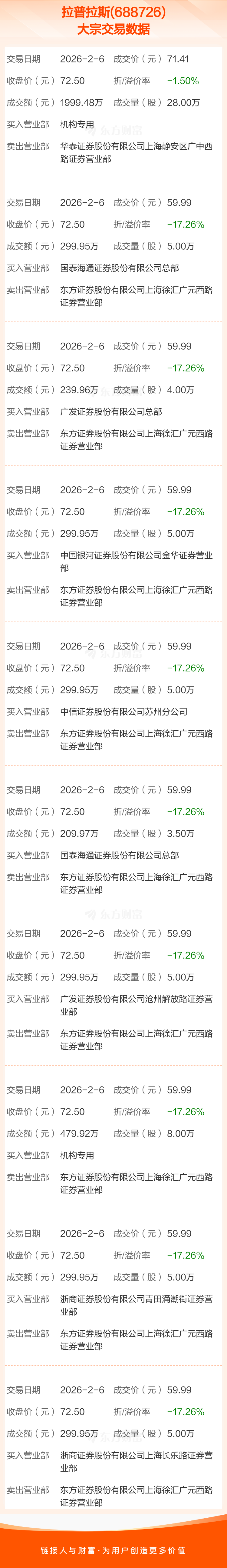 2026年2月6日,拉普拉斯发生10笔大宗交易,共成交73.50万股,成交金额4729.03万元,占其流通市值比例为0.30%。