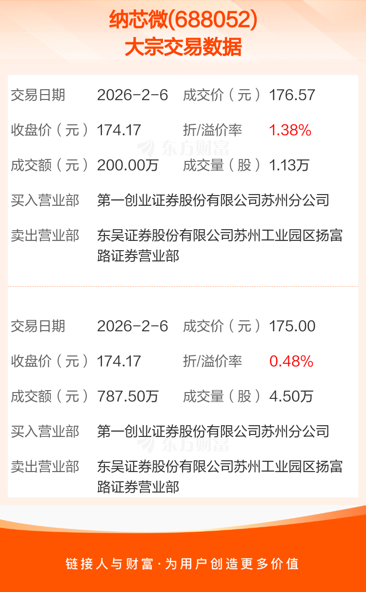 2026年2月6日,纳芯微发生2笔大宗交易,共成交5.63万股,成交金额987.50万元,占其流通市值比例为0.04%。