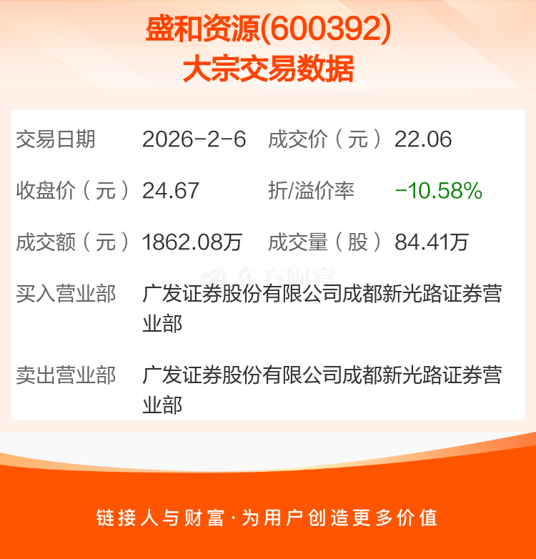 2026年2月6日,盛和资源发生1笔大宗交易,共成交84.41万股,成交金额1862.08万元,占其流通市值比例为0.04%。