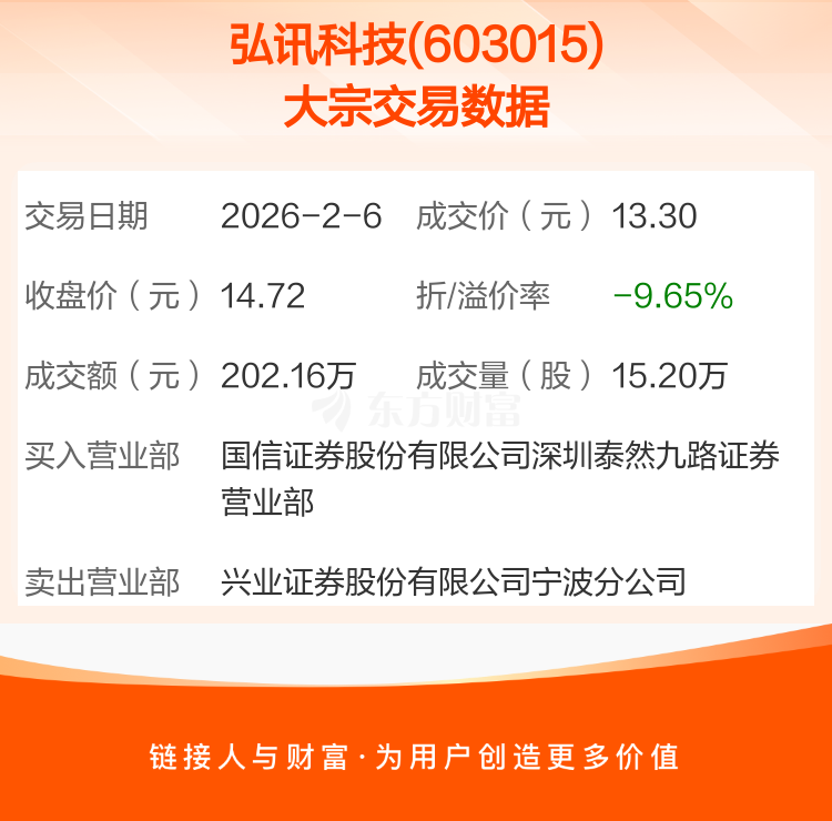 2026年2月6日,弘讯科技发生1笔大宗交易,共成交15.20万股,成交金额202.16万元,占其流通市值比例为0.03%。