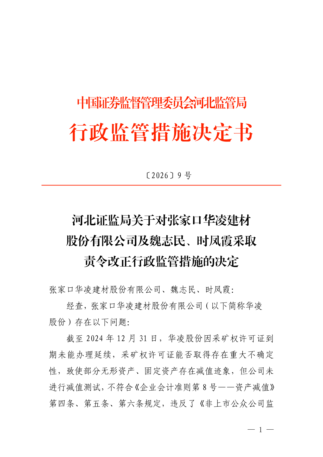 决定书显示,张家口华凌建材股份有限公司存在以下问题:截至2024年12月31日,华凌股份因采矿权许可证到期未能办理延续,采矿权许可证能否取得存在重大不确定性,致使部分无形资产、固定资产存在减值迹象,但公司未进行减值测试。