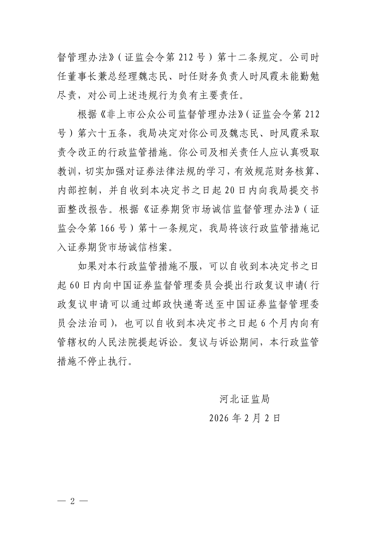 蓝鲸新闻2月6日讯,近日,河北证监局发布行政监管措施决定书,剑指张家口华凌建材股份有限公司、魏志民、时凤霞。