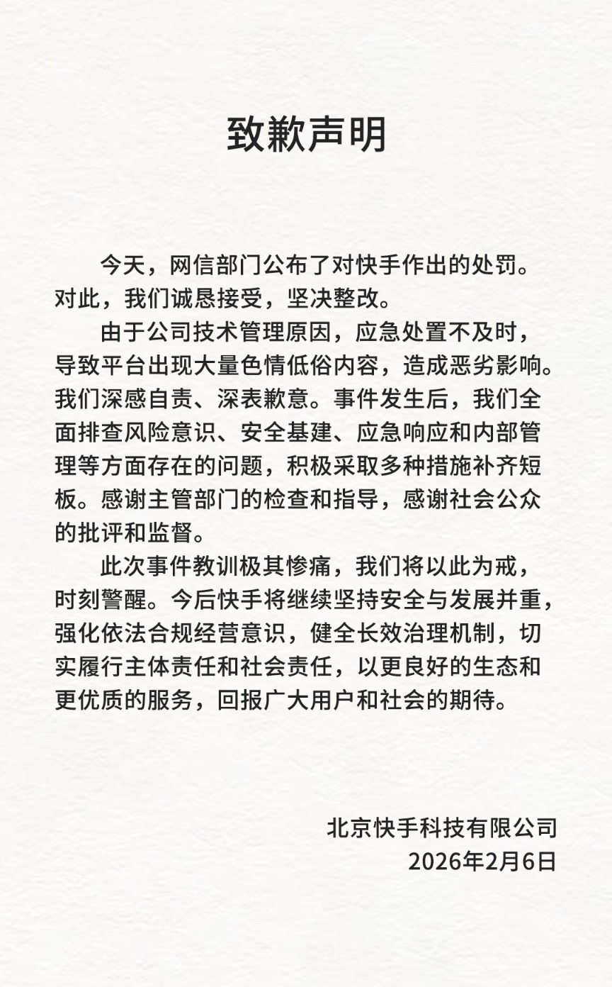 【大河财立方消息】2月6日,快手发布声明表示,对网信部门作出的处罚诚恳接受,坚决整改。