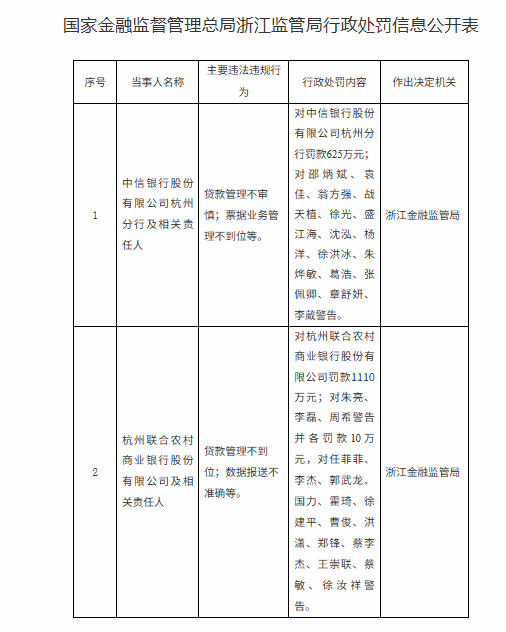 2月6日,国家金融监督管理总局浙江监管局披露的行政处罚信息公开表显示,杭州联合农村商业银行股份有限公司因贷款管理不到位、数据报送不准确等,被罚1110万元。
