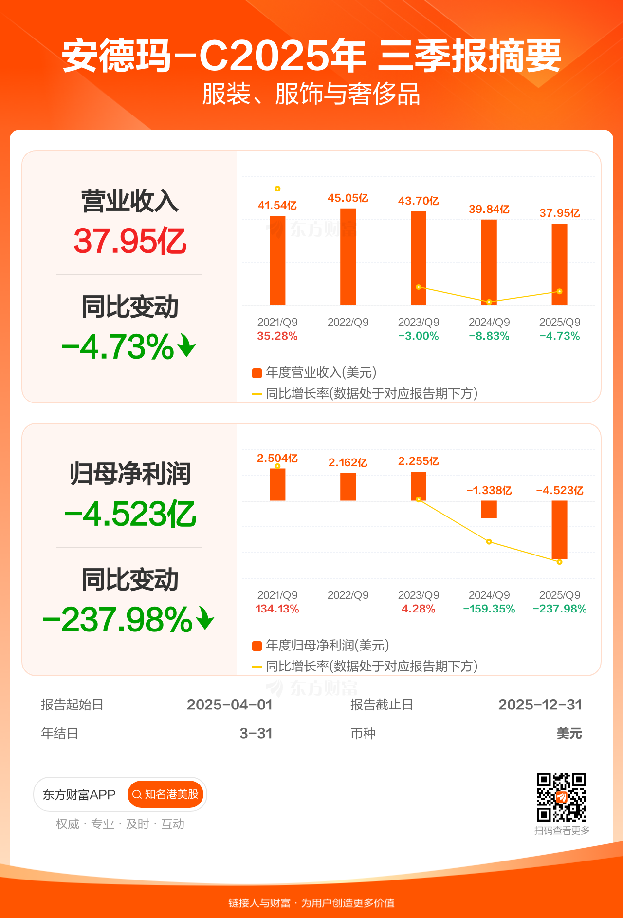 安德玛-C2月6日发布三季报业绩,截至2025年12月31日的9个月内,该公司营业收入37.95亿美元,同比减少4.73%;公司权益持有人应占溢利(归母净利润)-4.52亿美元,上年同期-1.34亿美元。