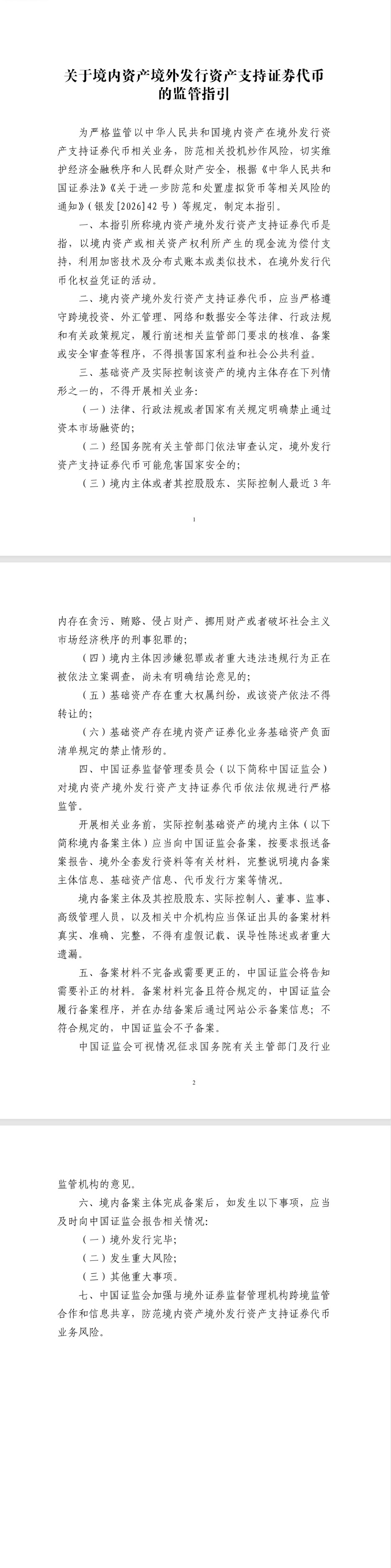 【大河财立方消息】2月6日晚间,证监会发布《关于境内资产境外发行资产支持证券代币的监管指引》。