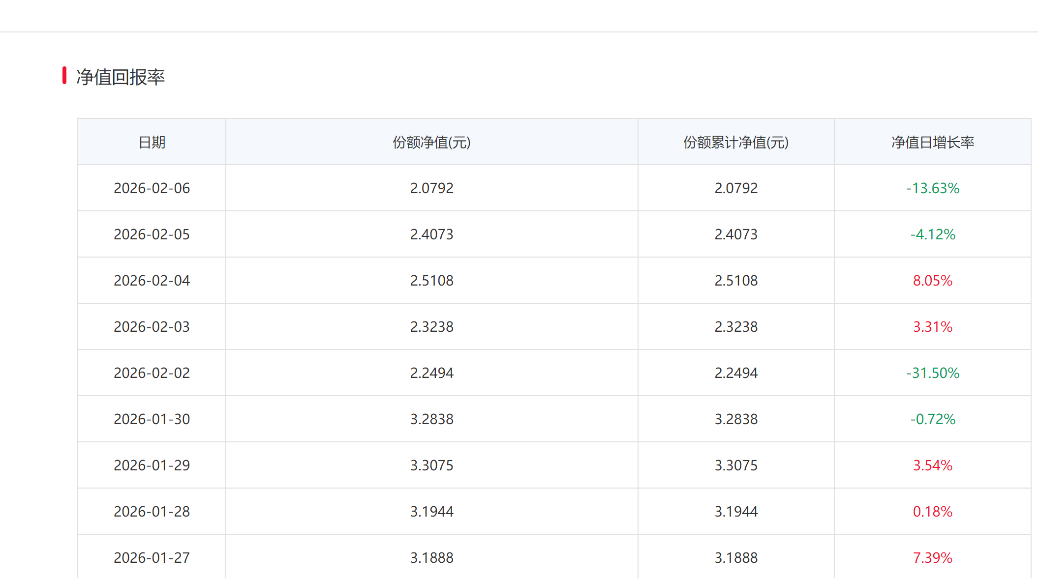 最新数据显示,2月6日,国投白银期货A(161226)单位净值报2.0792元,单日下跌13.63%。