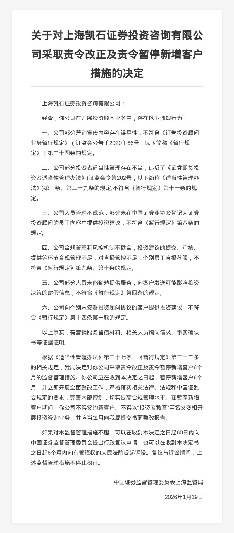 上海凯石证券投资咨询被责令改正及暂停新增客户6个月,涉误导性营销等