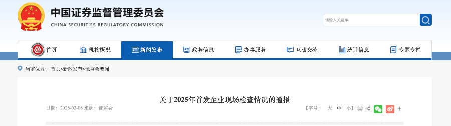2月6日晚间,证监会发布《关于2025年首发企业现场检查情况的通报》,披露全年完成20家首发申请企业的现场检查工作,包括16家随机抽取及4家问题导向企业。