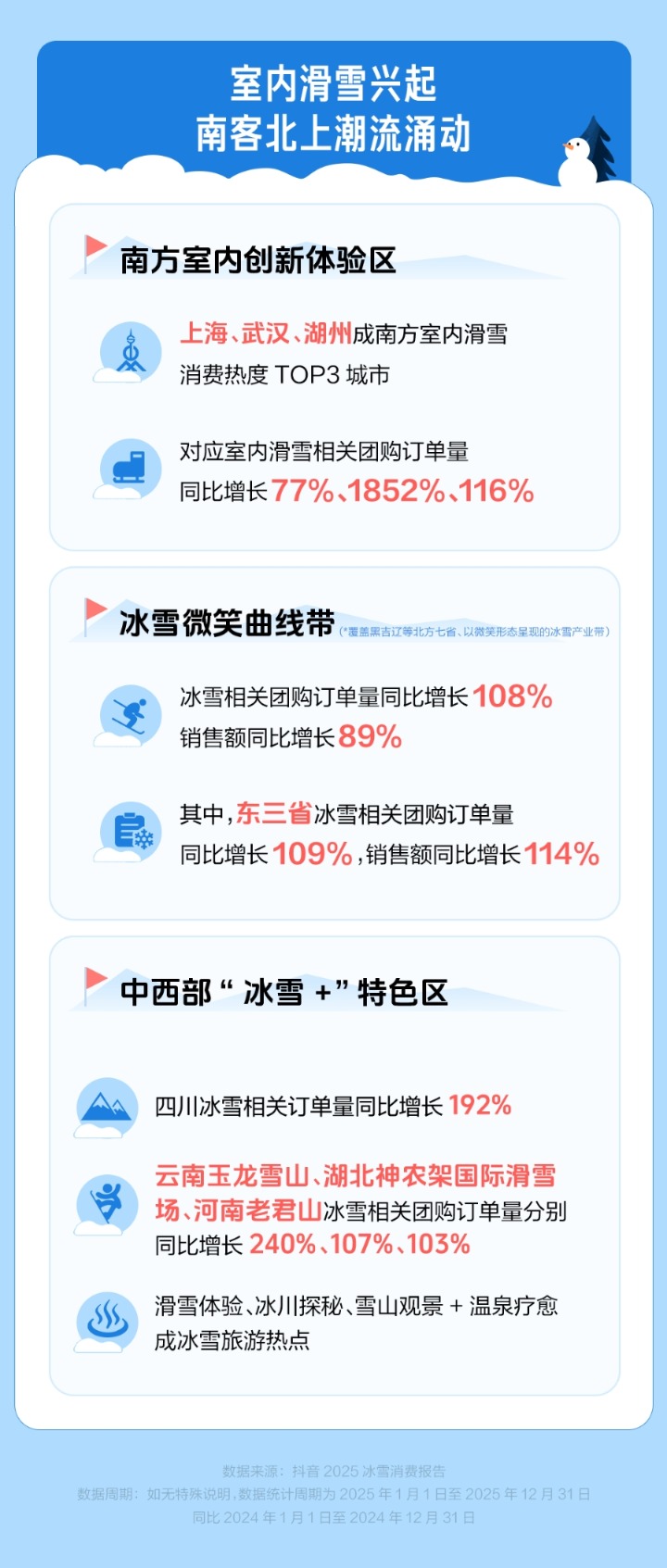 2025年11月起,抖音生活服务发起“冰雪季”活动,联合游玩、住宿、旅行社等19个品类商家,累计提供超5万种冰雪商品,通过百万爆品、线上线下促销、区域特色IP打造,激发各地冰雪消费热情。抖音生活服务“冰雪季”活动相关负责人介绍,活动不仅上线百万爆品,也为用户发放专属消费补贴。平台将持续通过内容种草、达人探店、特色IP联名,助力线下冰雪消费。