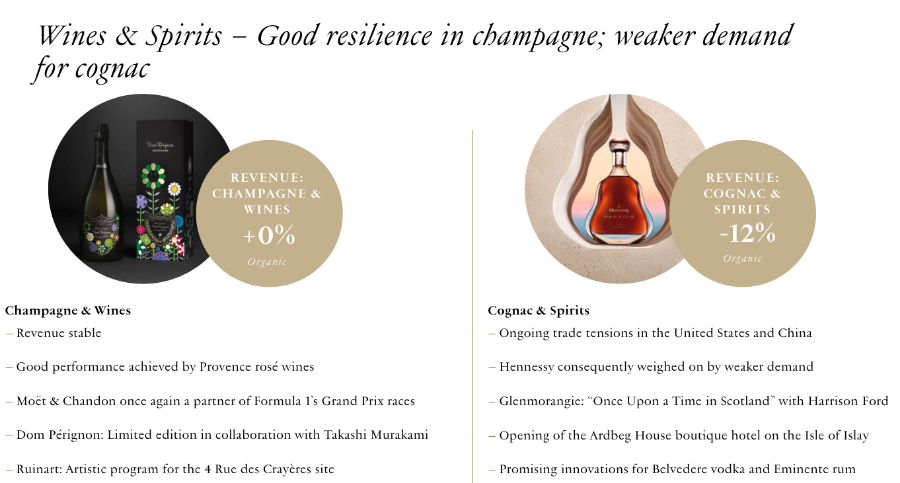 而进一步分析业务可以看出,真正拖累酒类业务的正是轩尼诗为代表的烈酒业务——“香槟与葡萄酒”2025年稳住了局势,有机营收与前一年持平。而“干邑与烈酒”过去一年营收下滑15%(有机下滑12%)。