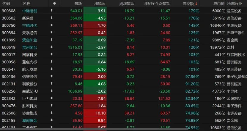 市场个股涨跌互现,2550只个股收跌,跌停股10只;2749只个股收红,涨停股61只。成交额方面,仅9只个股日成交额超100亿元。宁德时代收涨1.7%报369.11元/股,天孚通信微红;多数热门股跌幅靠前,中际旭创跌近4%,新易盛跌近5%,航天发展跌逾5%,贵州茅台收跌2.57%报1515.01元/股。
