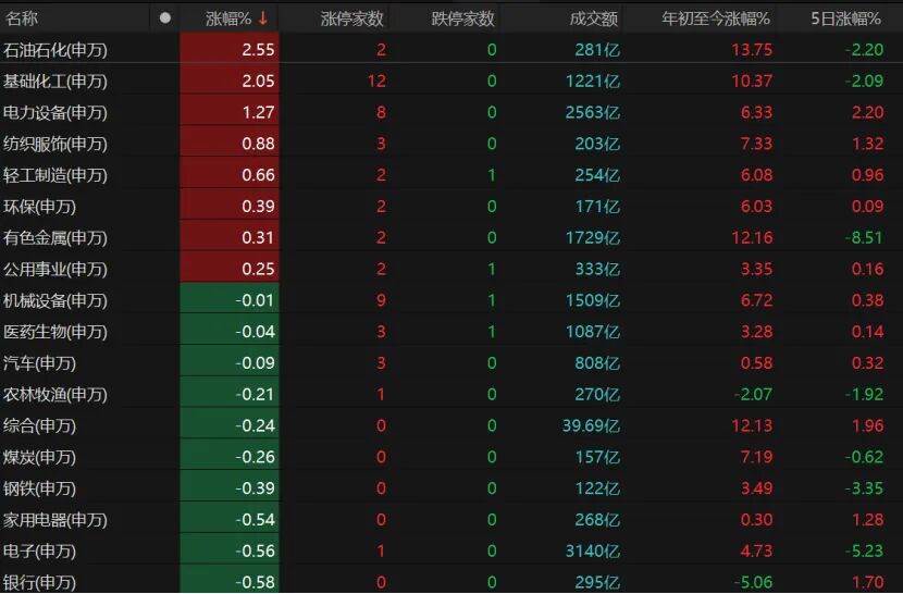 8个申万一级行业飘红,石油石化、基础化工板块涨幅超过2%,电力设备、纺织服饰、轻工制造、有色金属板块收红。