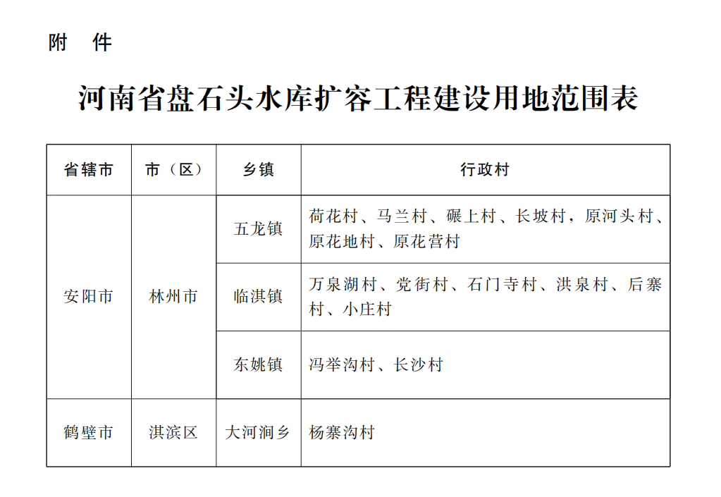 河南省盘石头水库扩容工程涉及安阳、鹤壁市2个市(区)4个乡镇16个行政村。自通知下发之日起,任何单位和个人不得在工程建设用地范围内擅自新建、扩建和改建项目,不得植树和建设温室大棚、畜禽圈厩以及开挖坑塘、修建房屋、弃土弃渣、堆料占用等。对违反规定建设的建筑物,按违法建筑严肃处理,搬迁时一律不予补偿。