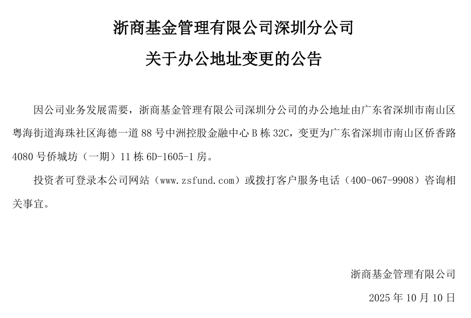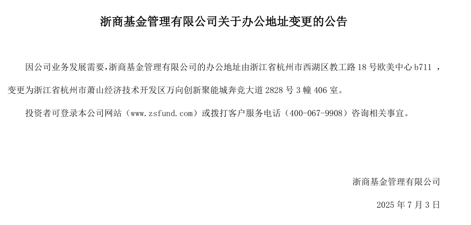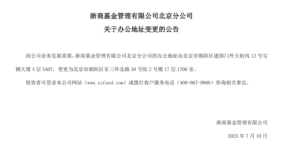 浙商基金于2010年9月28日获批设立,同年10月正式开业运营,注册地为杭州。公司现有股东方包括民生人寿保险股份有限公司、浙商证券股份有限公司和养生堂有限公司。去年下半年,公司办公地址从浙江省杭州市西湖区变更为杭州市萧山经济技术开发区,其北京分公司的办公地址由北京市朝阳区建国门外大街变更为朝阳区东三环北路,深圳分公司的办公地址由广东省深圳市南山区粤海街道海珠社区变更为深圳市南山区侨香路侨城坊。浙商基金在公告中表示以上变更是因为“公司业务发展需要”。