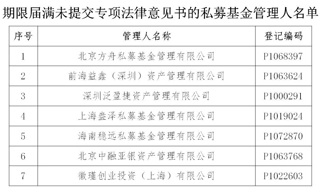 公告中提到,北京方舟私募基金管理有限公司等7家私募基金管理人存在异常经营情形,且未能在书面通知发出后的3个月内提交符合规定的专项法律意见书,中国证券投资基金业协会将注销该7家机构的私募基金管理人登记。