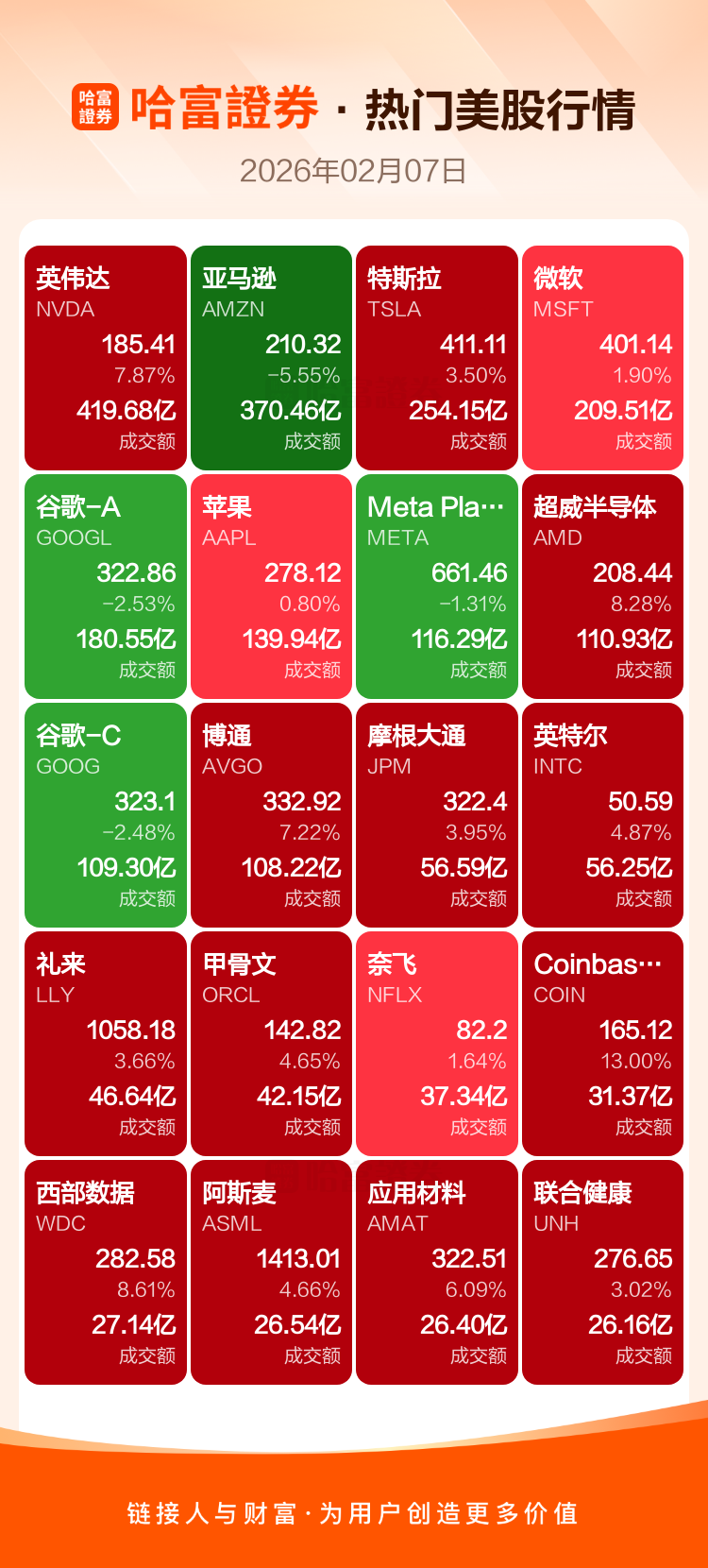 英伟达涨7.87%,亚马逊跌5.55%,特斯拉涨3.50%,微软涨1.90%,谷歌-A跌2.53%,苹果涨0.80%,Meta Platforms Inc-A跌1.31%,超威半导体涨8.28%,谷歌-C跌2.48%,博通涨7.22%。