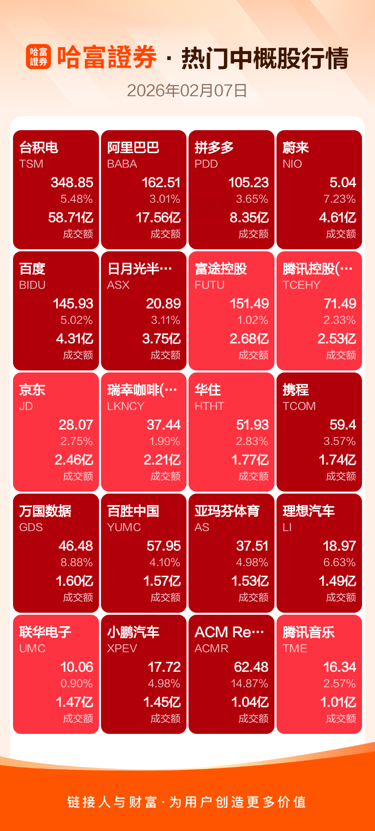 台积电涨5.48%,阿里巴巴涨3.01%,拼多多涨3.65%,蔚来涨7.23%,百度涨5.02%,日月光半导体涨3.11%,富途控股涨1.02%,腾讯控股(ADR)涨2.33%,京东涨2.75%,瑞幸咖啡(ADR)涨1.99%。
