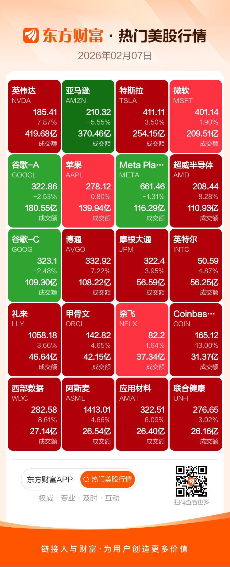 英伟达涨7.87%,亚马逊跌5.55%,特斯拉涨3.50%,微软涨1.90%,谷歌-A跌2.53%,苹果涨0.80%,Meta Platforms Inc-A跌1.31%,超威半导体涨8.28%,谷歌-C跌2.48%,博通涨7.22%。