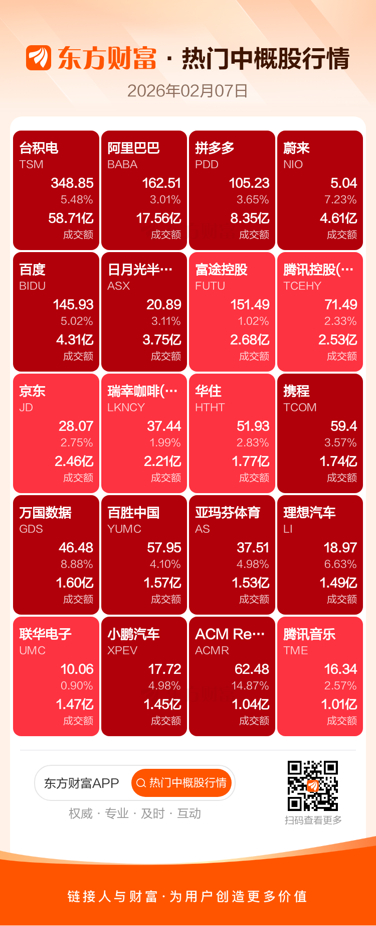 台积电涨5.48%,阿里巴巴涨3.01%,拼多多涨3.65%,蔚来涨7.23%,百度涨5.02%,日月光半导体涨3.11%,富途控股涨1.02%,腾讯控股(ADR)涨2.33%,京东涨2.75%,瑞幸咖啡(ADR)涨1.99%。