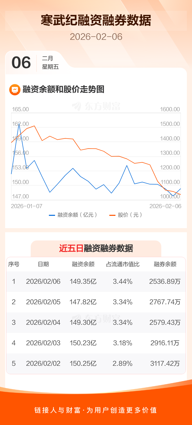 交易所最新数据显示,寒武纪于2026年2月6日获融资买入7.88亿元,融资偿还6.36亿元,当日融资净买入1.53亿元。目前,该股融资余额149.35亿,占流通市值比例为3.44%。