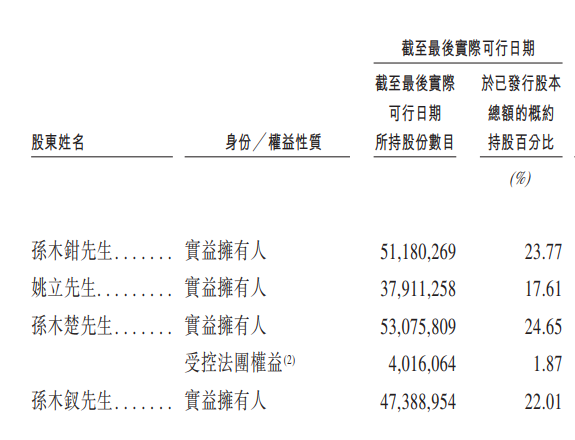 从持股比例来看,孙木钳持股23.77%,姚立持股17.61%,孙木楚持股26.52%,孙木钗持股22.01%,创始人团队合计持股比例高达89.91%。其中,孙氏家族的持股比例达72.3%。