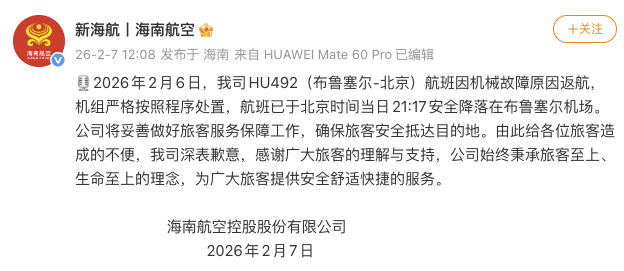 海南航空2月7日通报:2月6日,我司HU492(布鲁塞尔-北京)航班因机械故障原因返航,机组严格按照程序处置,航班已于北京时间当日21:17安全降落在布鲁塞尔机场。公司将妥善做好旅客服务保障工作,确保旅客安全抵达目的地。由此给各位旅客造成的不便,我司深表歉意,感谢广大旅客的理解与支持,公司始终秉承旅客至上、生命至上的理念,为广大旅客提供安全舒适快捷的服务。