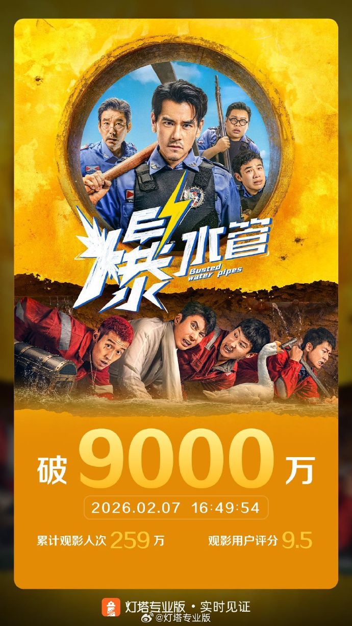 据灯塔专业版实时数据,截至2月7日16时49分,影片《爆水管》票房突破9000万元。