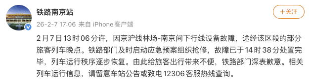 2月7日17时06分,@铁路南京站发布通报:2月7日13时06分许,因京沪线林场-南京间下行线设备故障,途经该区段的部分旅客列车晚点。铁路部门及时启动应急预案组织抢修,故障已于14时38分处置完毕,列车运行秩序逐步恢复。由此给旅客出行带来不便,铁路部门深表歉意。相关列车运行信息,请留意车站公告或致电12306客服热线查询。