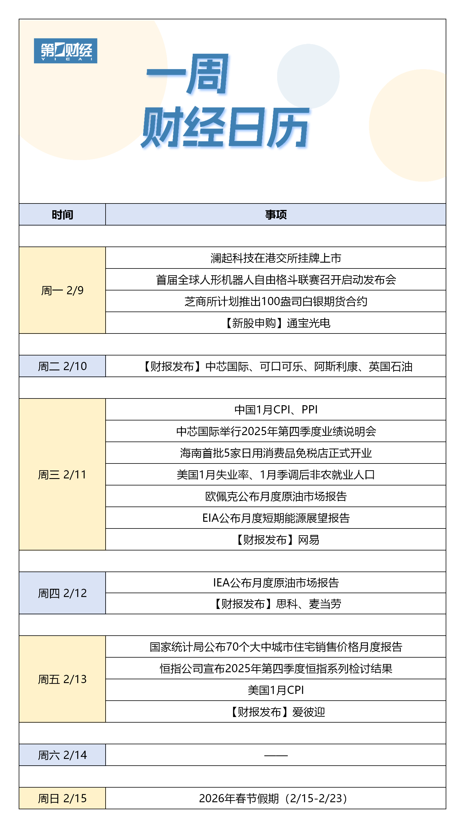 下周财经日历(2月9日-2月15日)