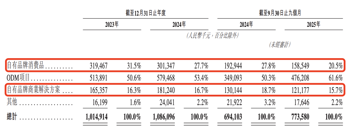 虽然鹿客科技营收及利润均上涨,但从数据来看,公司自有品牌相关业务却出现下滑。其中自有品牌消费品于2024年及2025年前三季度均出现营收同比减少;自有品牌商业解决方案则在2025年前三季度出现下滑。