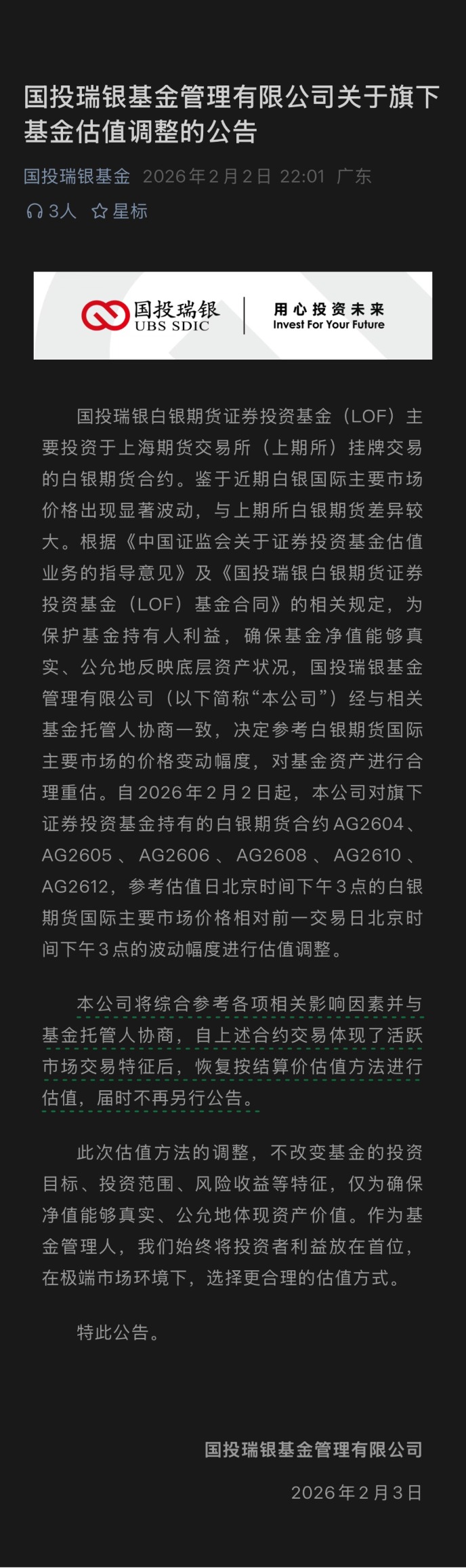 2月2日收盘后,国投瑞银在未提前通知的情况下,临时调整国投白银LOF的估值方法,将按相应期货合约结算价估值方法进行估值。