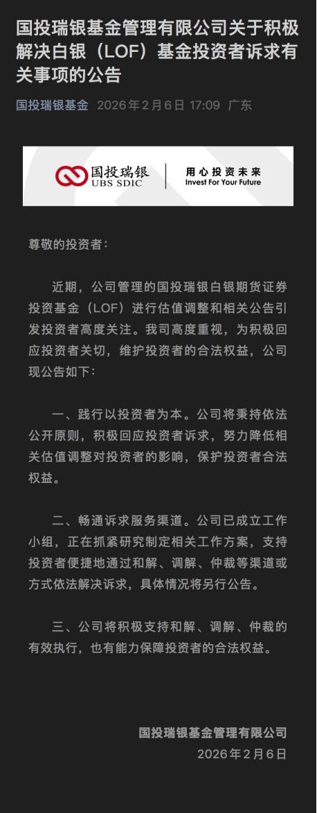2月6日,国投瑞银基金管理有限公司(简称国投瑞银)发布公告,回应此前国投白银LOF估值调整给投资者带来的影响。