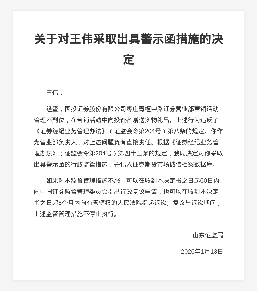 国投证券枣庄青檀中路营业部被出具警示函,涉营销活动管理不到位