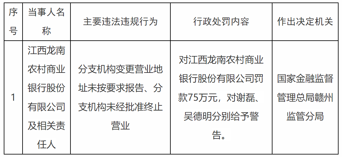 罚单显示,江西龙南农村商业银行股份有限公司的主要违法违规行为是:分支机构变更营业地址未按要求报告、分支机构未经批准终止营业。