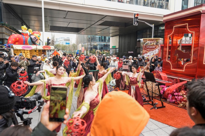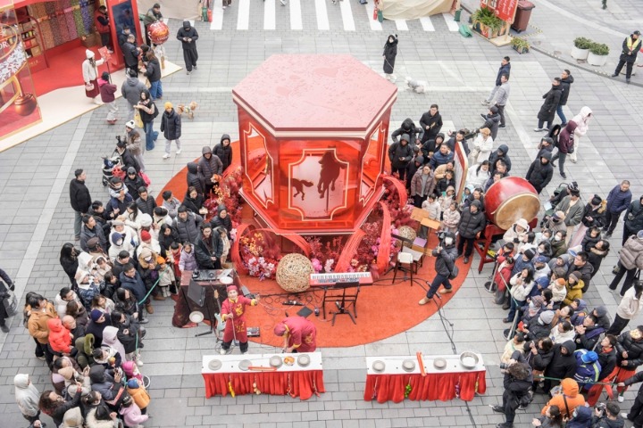 2月7日下午一场创意融合非物质文化遗产与现代表演艺术的音乐会——「非遗新声喜乐会」在公园巷街区十字路口呈现。二胡、琵琶、马头琴、笛子、唢呐等传统乐器与钢琴、大提琴、键盘等现代乐器精彩碰撞,带来《云宫巡音》《游园惊梦》《Love Story》《青花瓷》《当》等耳熟能详的国风乐曲,引发全场大合唱,现场氛围热闹十足。