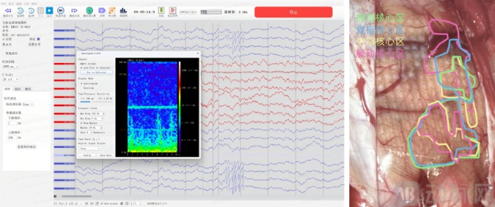 微灵医疗高通量神经电生理采集系统采集电生理信号(左)手部精细运动任务功能图谱展示(右),企业供图