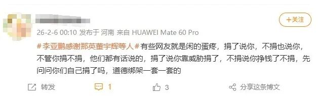 李亚鹏在当天的直播中说:“一个人做了好事,而且是真金白银做了事情,不敢说,这是他的问题吗?”