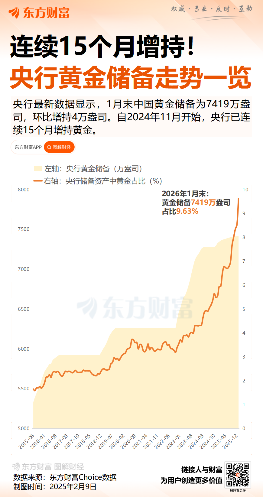 中国人民银行官网同日发布的数据显示,截至1月末,我国黄金储备为7419万盎司,环比增加4万盎司。至此,我国央行已连续第15个月增持黄金。